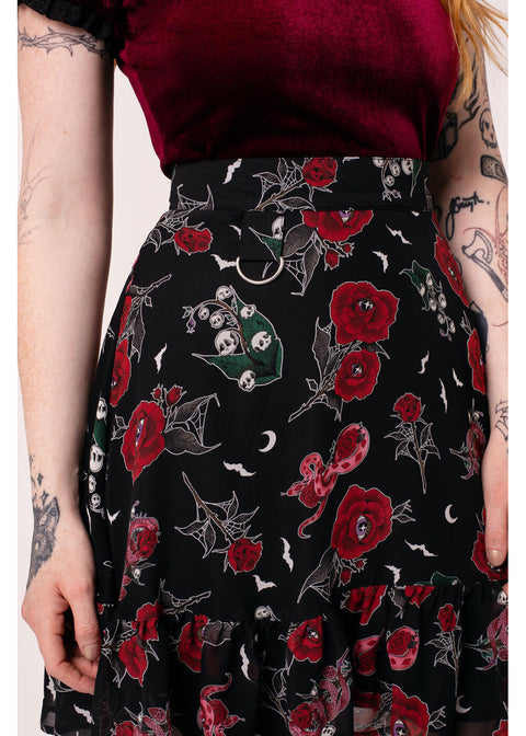 Do you also feel like you’re being watched? These romantic pink flowers hide something sinister. Their lovely petals are accompanied by bats, snakes, and Little Skull Van Dalen. Blooming Elle calls upon all the dark creatures that want to conceal their true nature. Of course, that elegant ruffled skirt and flattering waistband contribute to the charm as well.