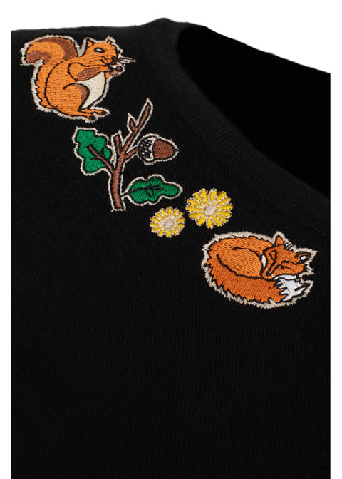 Who can resist a squirrel like Chester and a snoozing little fox? So vividly embroidered, they look like they could hop right off the soft knit fabric. This cardigan embodies the charm of the 40s and 50s with its smooth buttons and cozy long sleeves. Trust us, you won't wait for the first autumn leaves to fall before slipping into this retro darling β₯