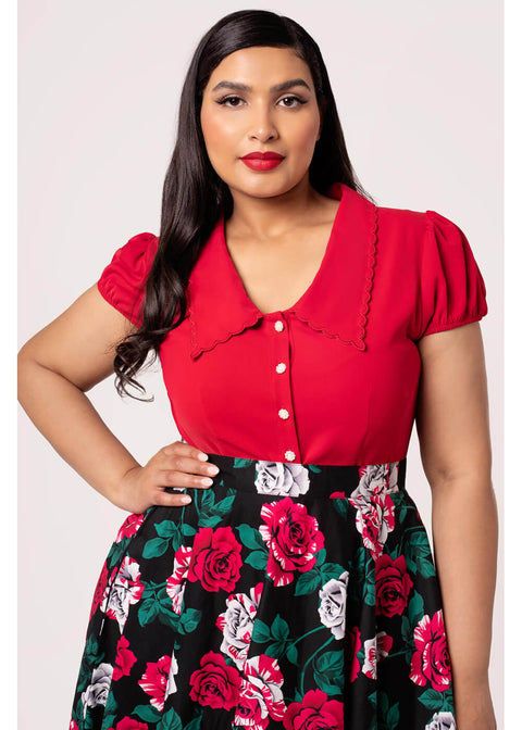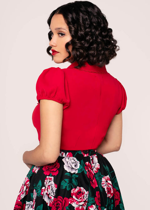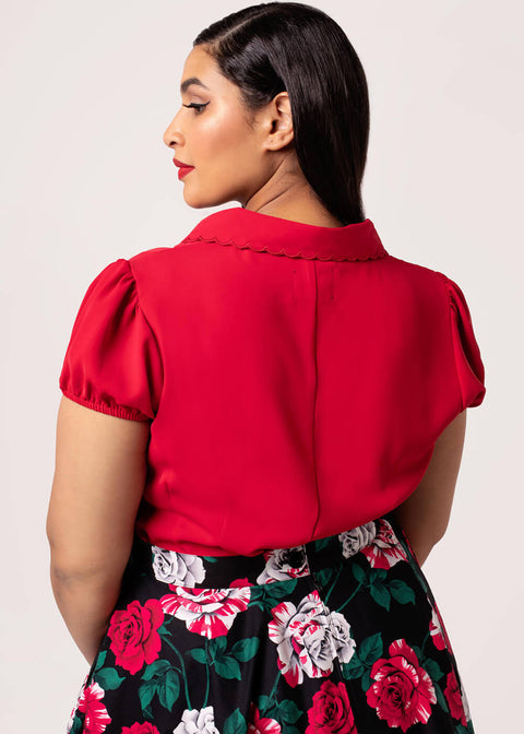 For every vintage lover, a 40's inspired blouse is an absolute must-have. If you haven't found your true match yet, now's your chance because Maddy is sure to steal your heart! Her scalloped collar and elegant faux pearl decorated buttons make it impossible to resist. We won't stop you ;)