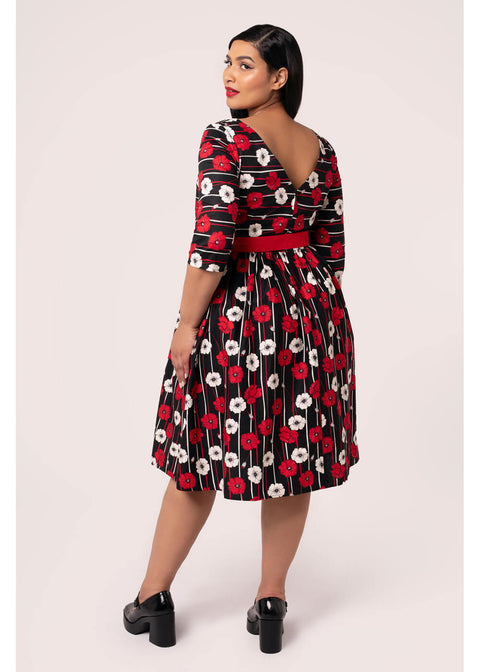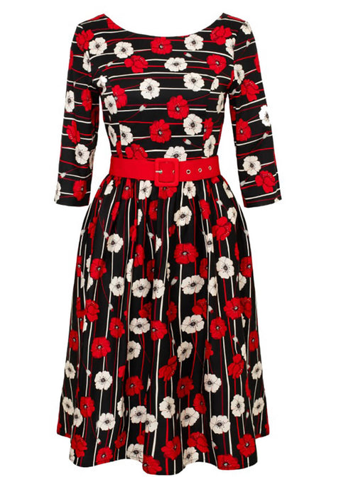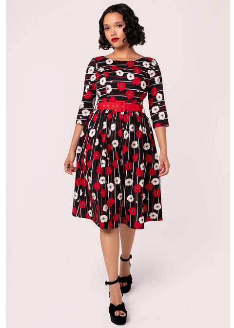 A shopping day in spring? Celebrations in winter? Every season, Poppy is your go-to with her stunning poppies that radiate from the black cotton-mix, and the matching red belt creates the perfect 50s silhouette. Who could resist such a bouquet?