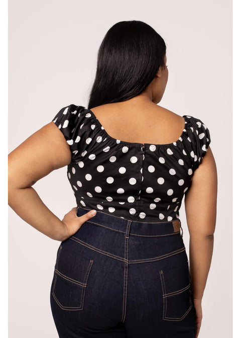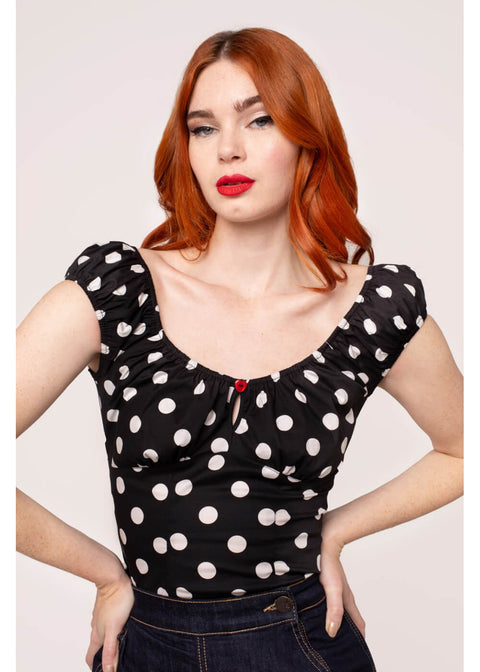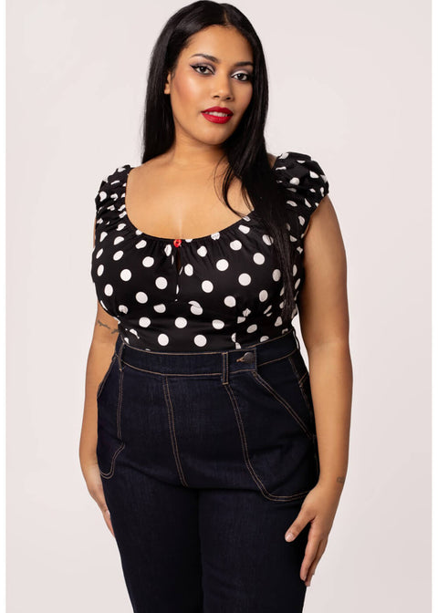 Just like puppies and chocolate, polka dots are one of those things that always manage to brighten your days: thankfully, Domino is covered in them! With a sweet red heart adorning the chest and a fabulous fit, a classic vintage look is guaranteed, along with a slight chance to show off a bit of shoulder ;)