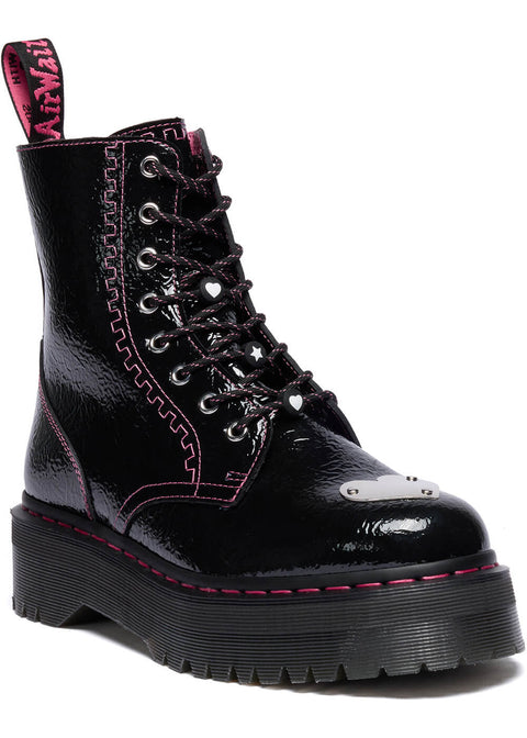 The Jadon takes you back to the '90s with its shiny distressed patent leather and platform sole! Featuring an eye-catching metal heart on the toe, pink lining, and pink stitching, it’s far from subtle. Whether paired with pants or a dress, for a festival or the office: you and your Docs are ready to take on the world!