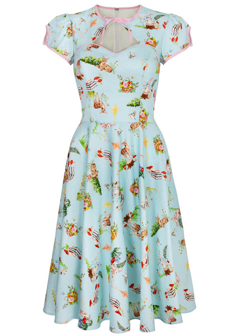 It's as if you've stepped straight into a storybook: soft blue skies filled with fluttering bunnies, fawns, birds, baskets of flowers, and even little stacks of books. The Beatrix dress is designed for swirling around—perfect for everything from spring picnics to garden parties, with a touch of magic in every step ♥