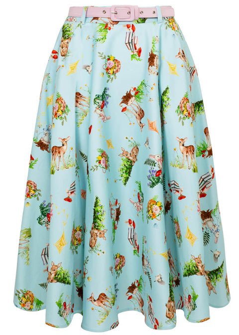 One twirl and you'll see the flower baskets, kites, and woodland creatures almost come to life. The light blue base and the pink belt give it a delightful charm, all while being beautifully retro—perfect with a simple top, a cardigan, or made extra festive with a petticoat ♥