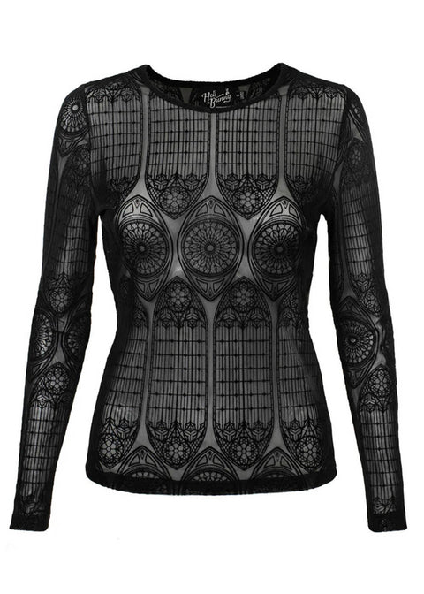 The Mea Culpa Top is a striking black piece made from stretchy mesh fabric, adorned with a lavish flock print reminiscent of gothic architecture. It's perfect for layering: over a lovely bralette, underneath a dress, or paired with a high-waisted skirt for a dark, elegant look ♥