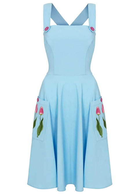 Light blue like a clear sky, adorned with cheerful tulips on the patch pockets that dance along with you with every step. The wide straps playfully cross at the back, giving it that irresistible retro pinafore look — sweet, breezy, and ready for picnics, markets, and sunny strolls. Will you wear it as is, or layer it with an elegant blouse or playful top?